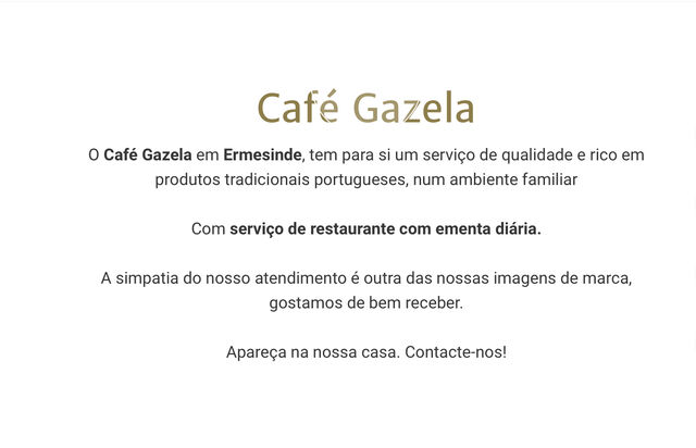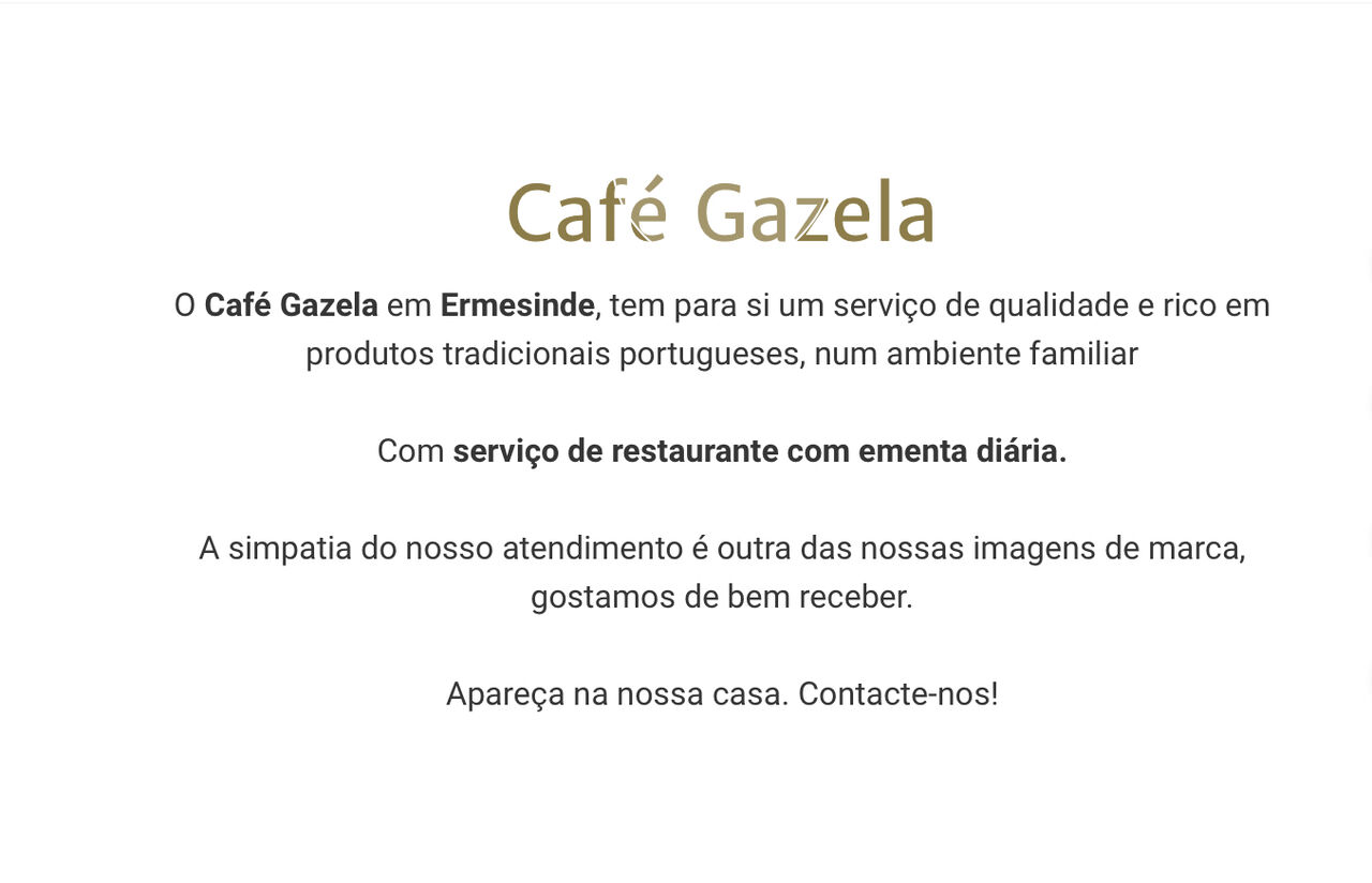 Queremos que passe uma tarde inesquecível com a sua família saboreando o café e os bolos únicos caseiros que temos para oferecer no «Gazela Café Restaurante». Venha cá e sinta-se em casa no nosso café muito acolhedor: é o sítio certo para se encontrar com amigos ou com a família ou simplesmente para ler um bom livro sem pressas. nn A nossa ementa também oferece iguarias vegetarianas para que os nossos clientes possam saborear esta rica diversidade culinária. Queremos mostrar-lhe como é simples ter uma alimentação saudável sem abdicar dos prazeres da comida.nn O nosso espaço climatizado garante-lhe momentos agradáveis.